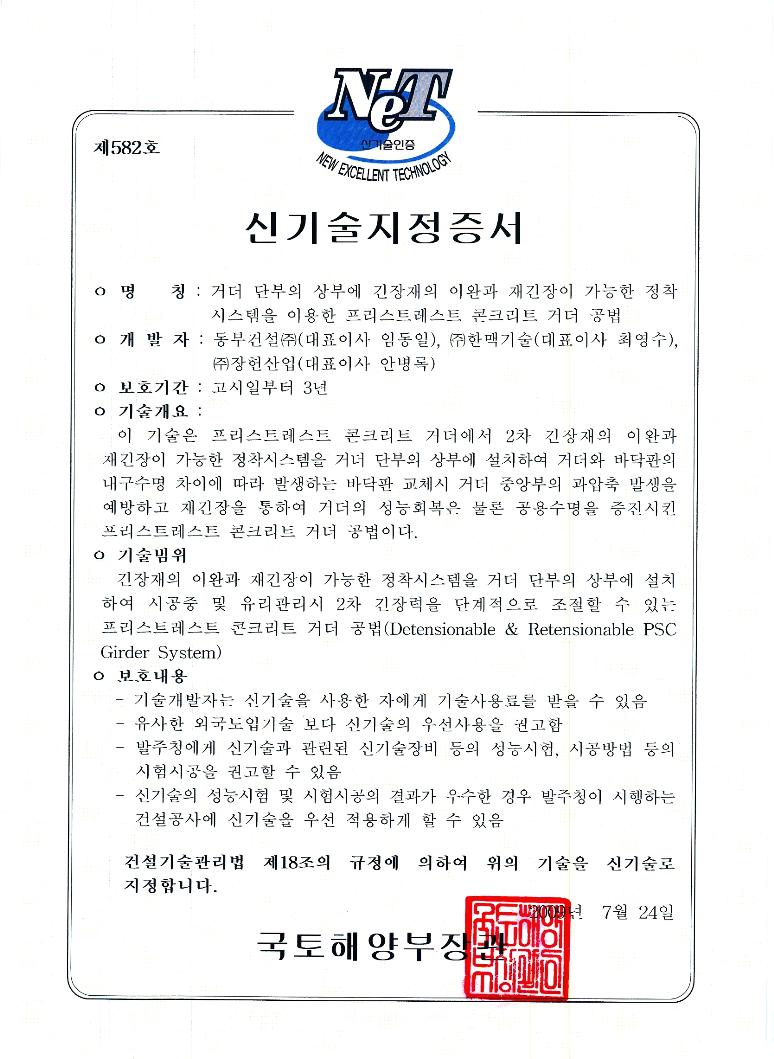 지정번호 : 제725호 신기술명 : 거더 단부의 상부에 긴장재의 이완과 재긴장이 가능한 정착시스템을 이용한 프리스트레스트 콘크리트 거더공법 등록일 : 2009.07.24